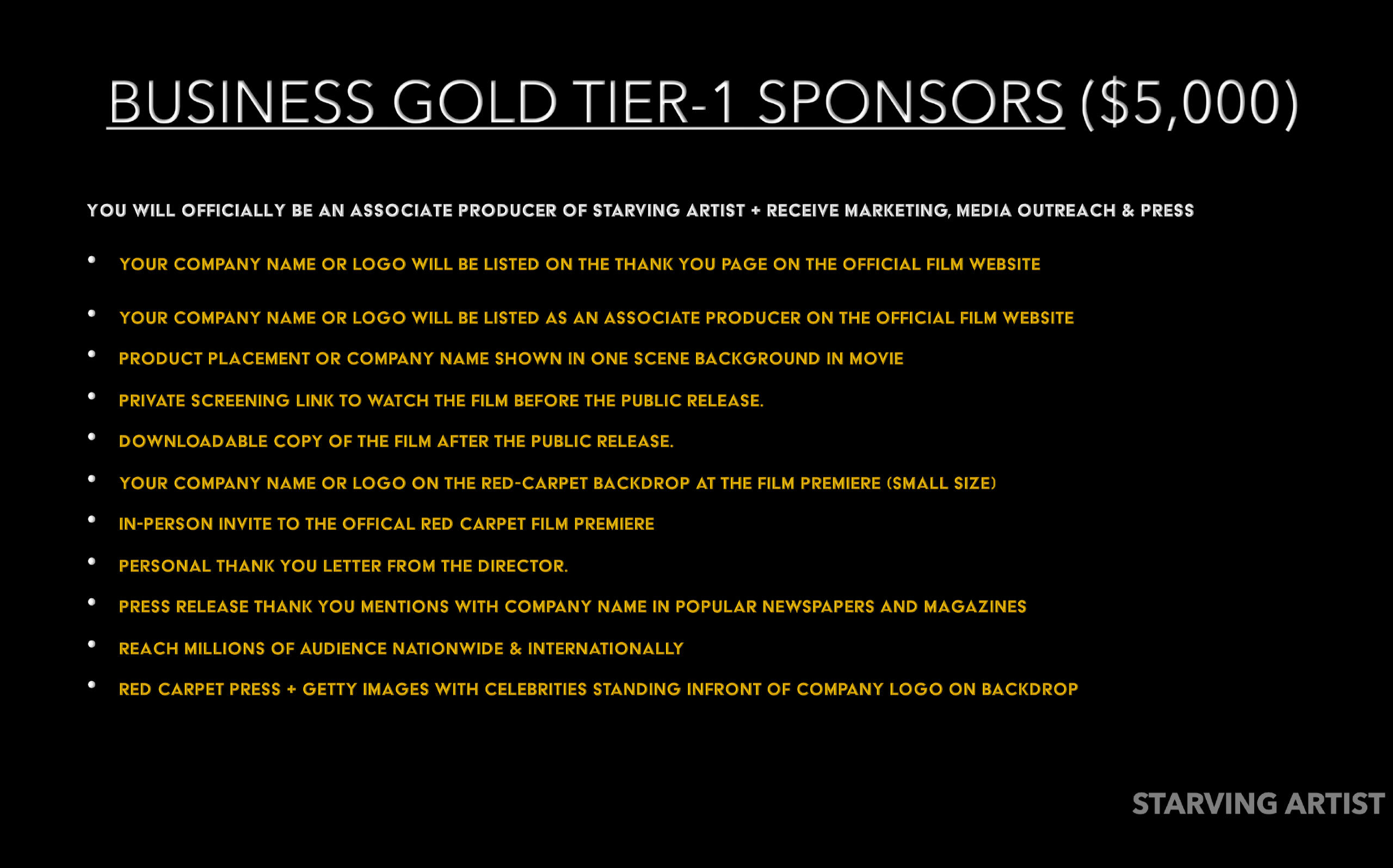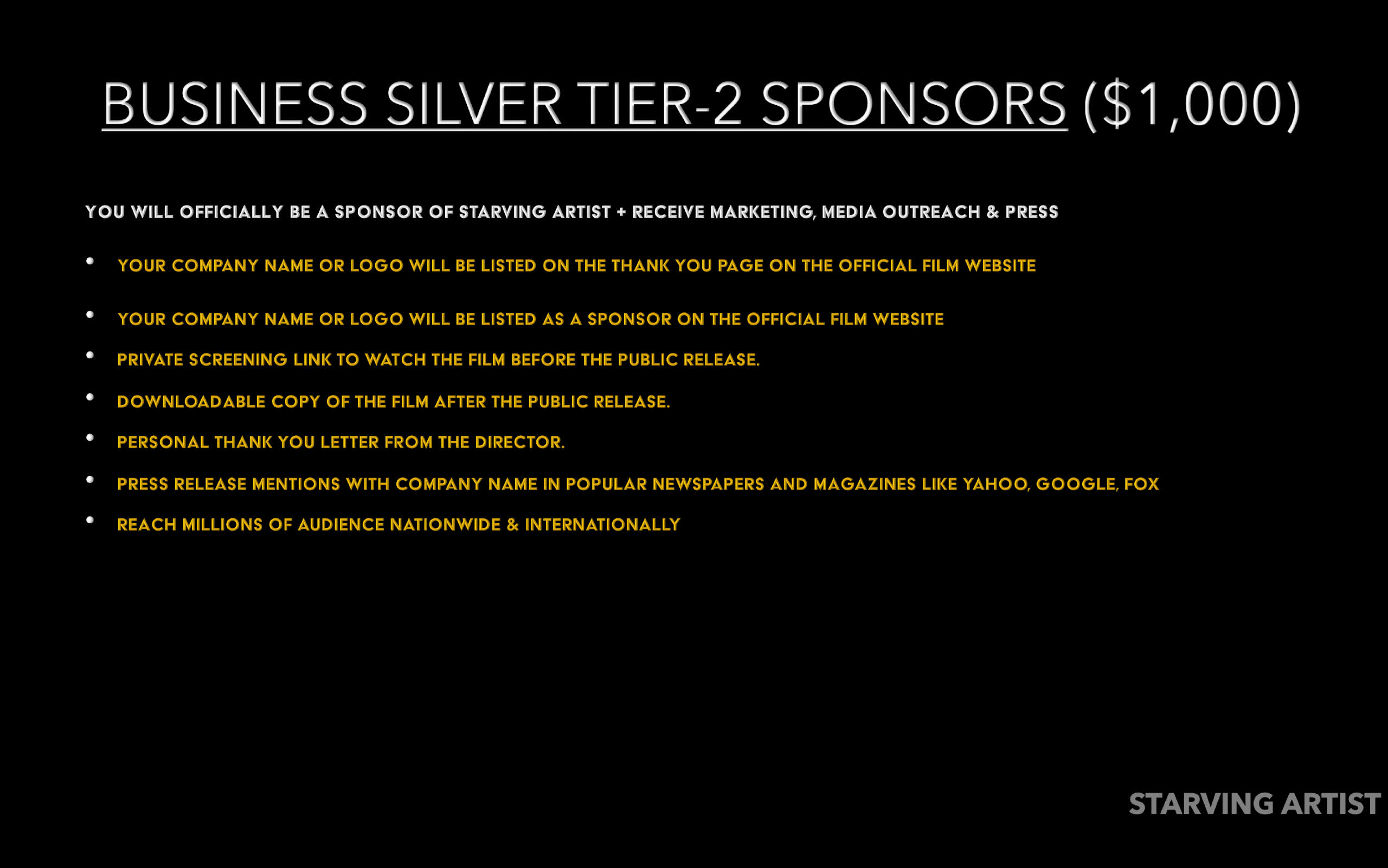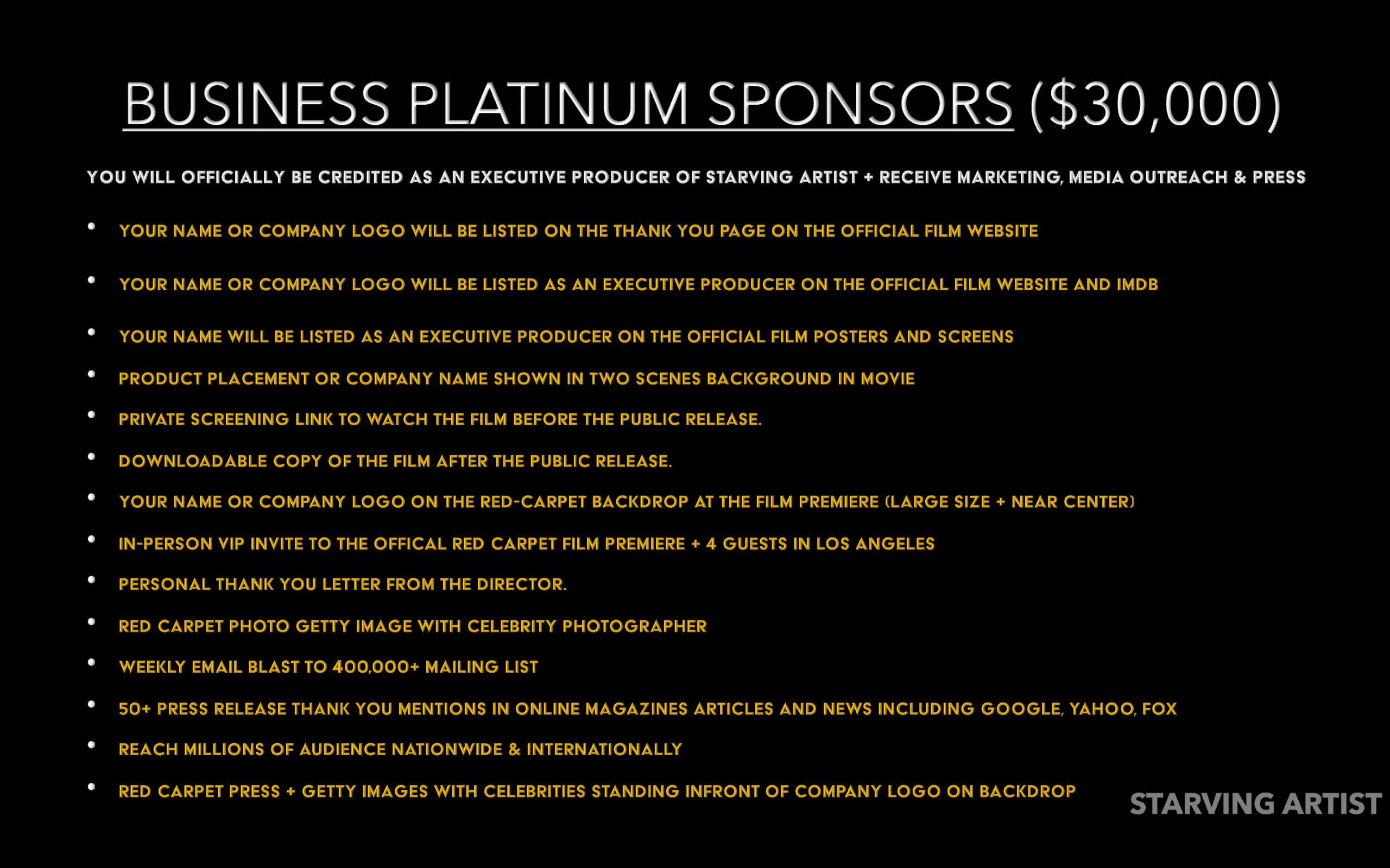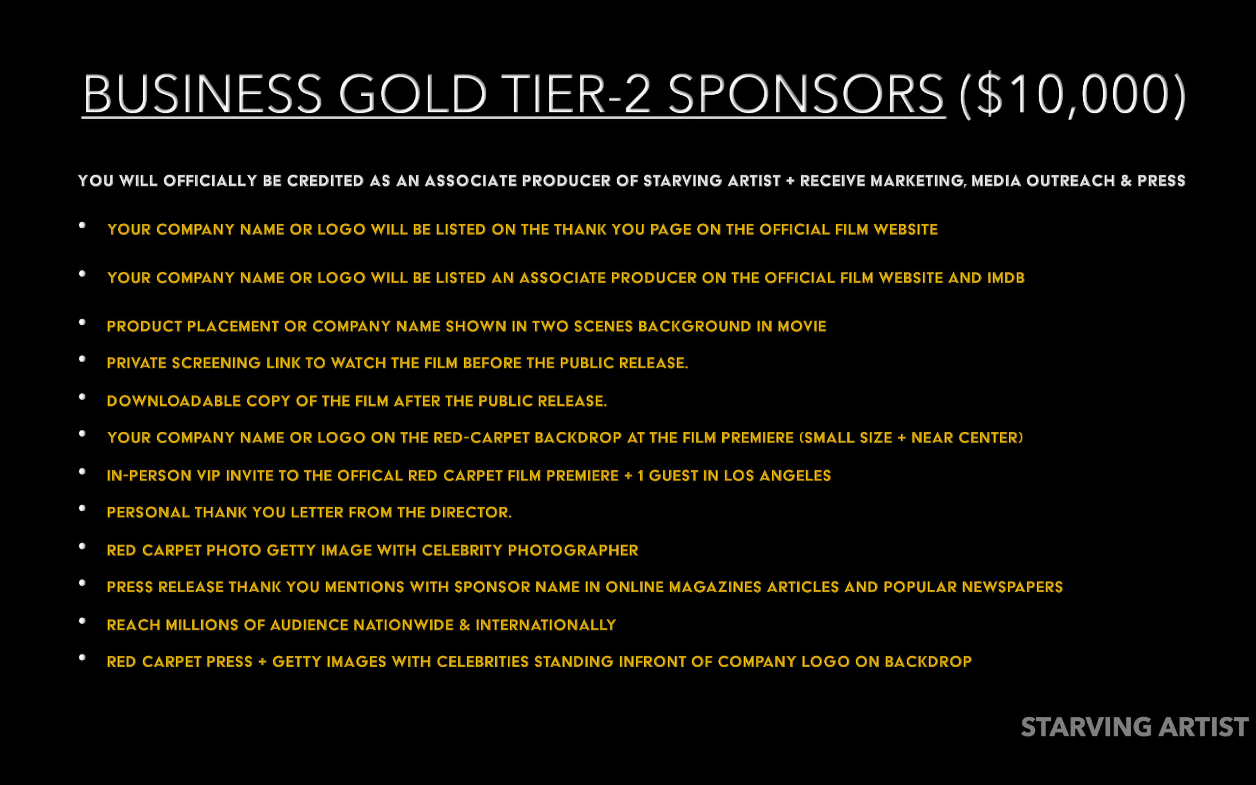 YOU can help independent filmmakers tell their stories!So we've put together packages of exclusive rewards for each donator of STARVING ARTIST, all from sneak peaks and limited edition signed scripts to highly sought film credits and much more.